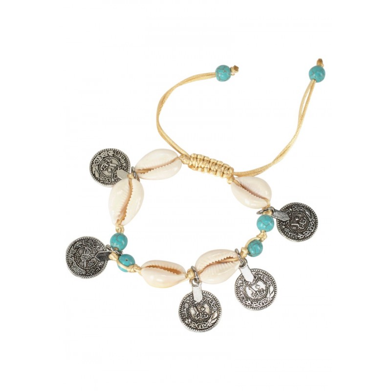 Wunderschönes Armband mit echten Kaurimuscheln. Textilband mit türkisen Perlen und Silbermünzen. Praktischer Zugverschluss, kein Knoten.