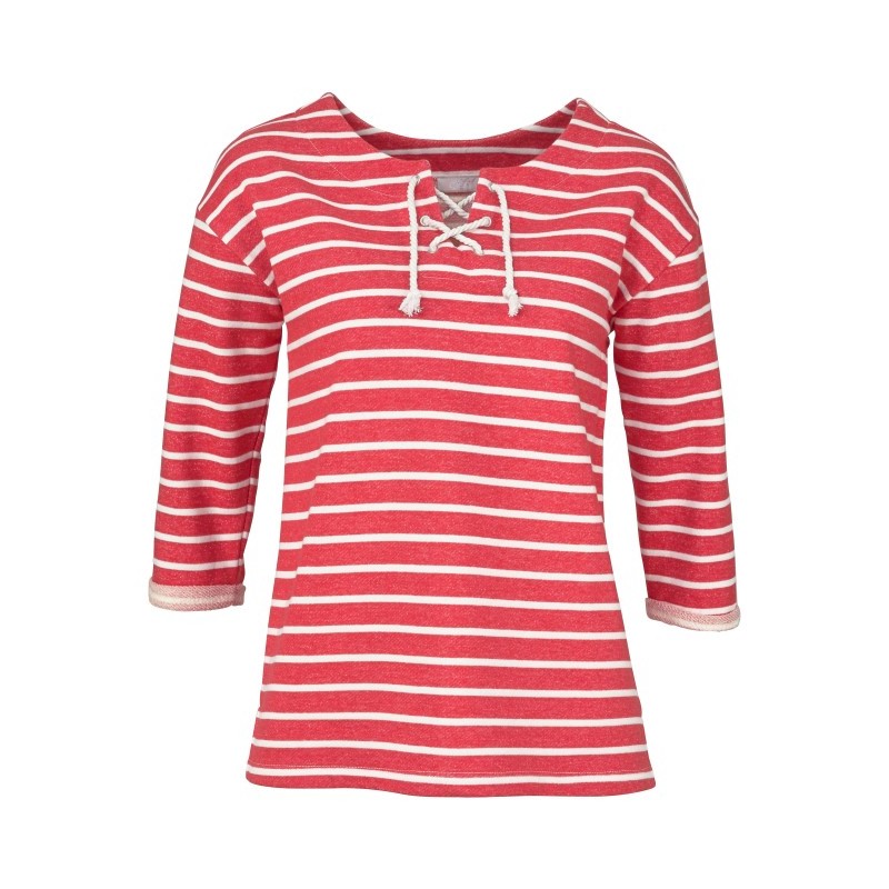 Shirt. Mit feinem Ringeldessin und kurzer Schnürung. ¾ -langer Ärmel. Länge in Gr. 42 ca. 66 cm. Figurumschmeichelnde Form. Reine Baumwolle. Maschinenwäsche.